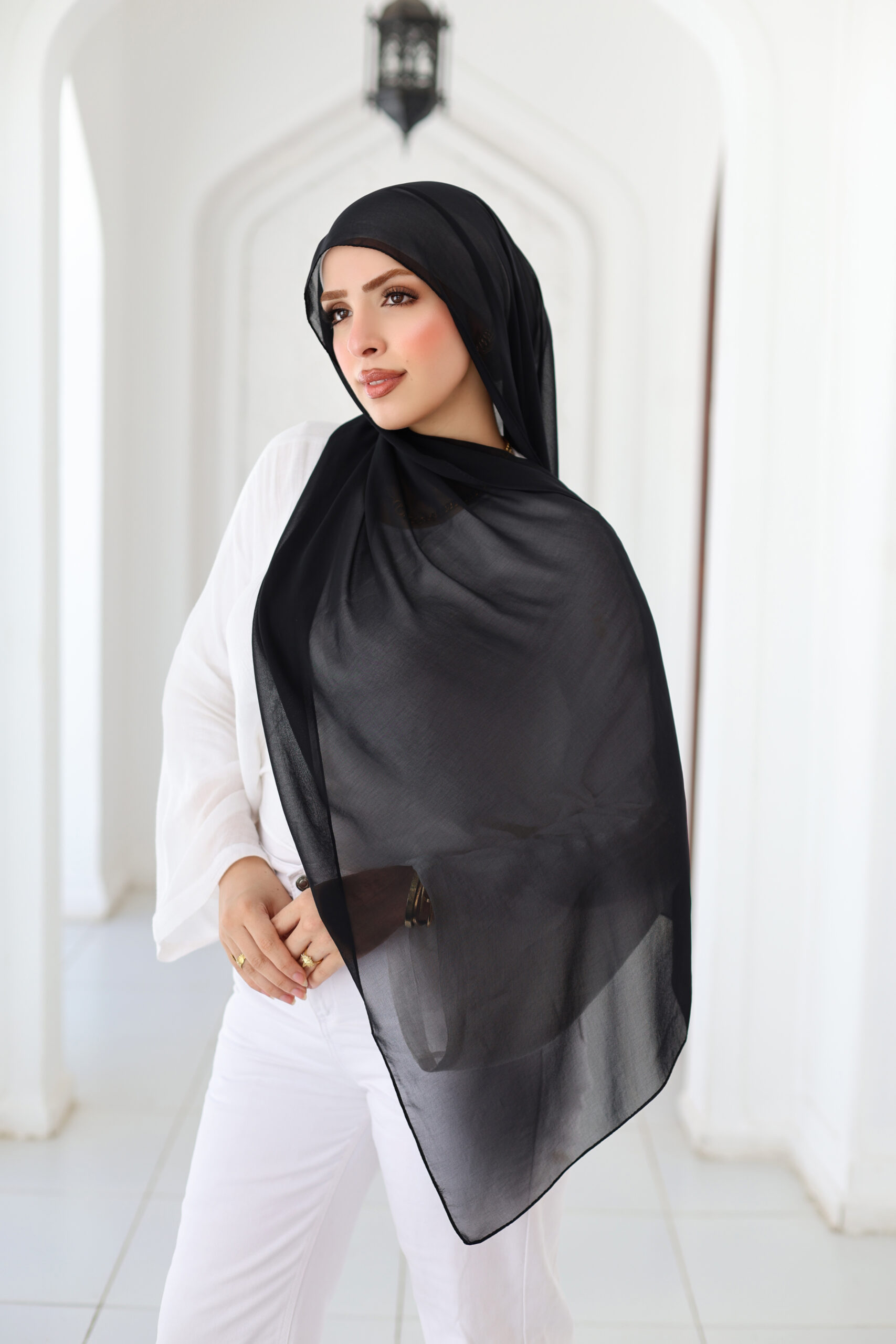 The Lara Black veil is a true classic — versatile, sleek, and effortlessly chic. Its lightweight chiffon fabric drapes gracefully, making it an essential piece for both daily wear and formal occasions.